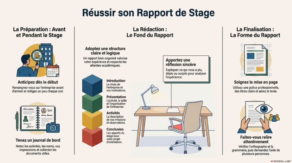 L’erreur classique ? Attendre le dernier moment pour commencer le rapport. Les recommandations sont claires : anticipez la rédaction dès le début du stage, voire avant.